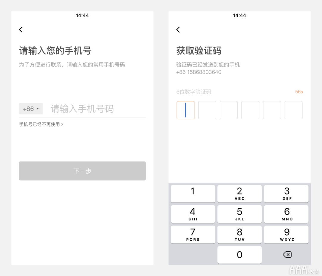 先输入手机号,点击“下一步”的同时,系统查询该手机号是否可以注册,通过的话则进入输入验证码页面,这样做的好处是可以及时反馈给用户,避免用户在输完手机号和验证码之后出现错误toast的情况。