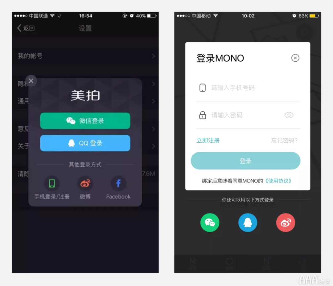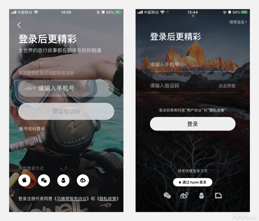 该方式多用在登录信息简单或者以第三方登录为主的界面中,在不干扰用户视线的基础上丰富页面。