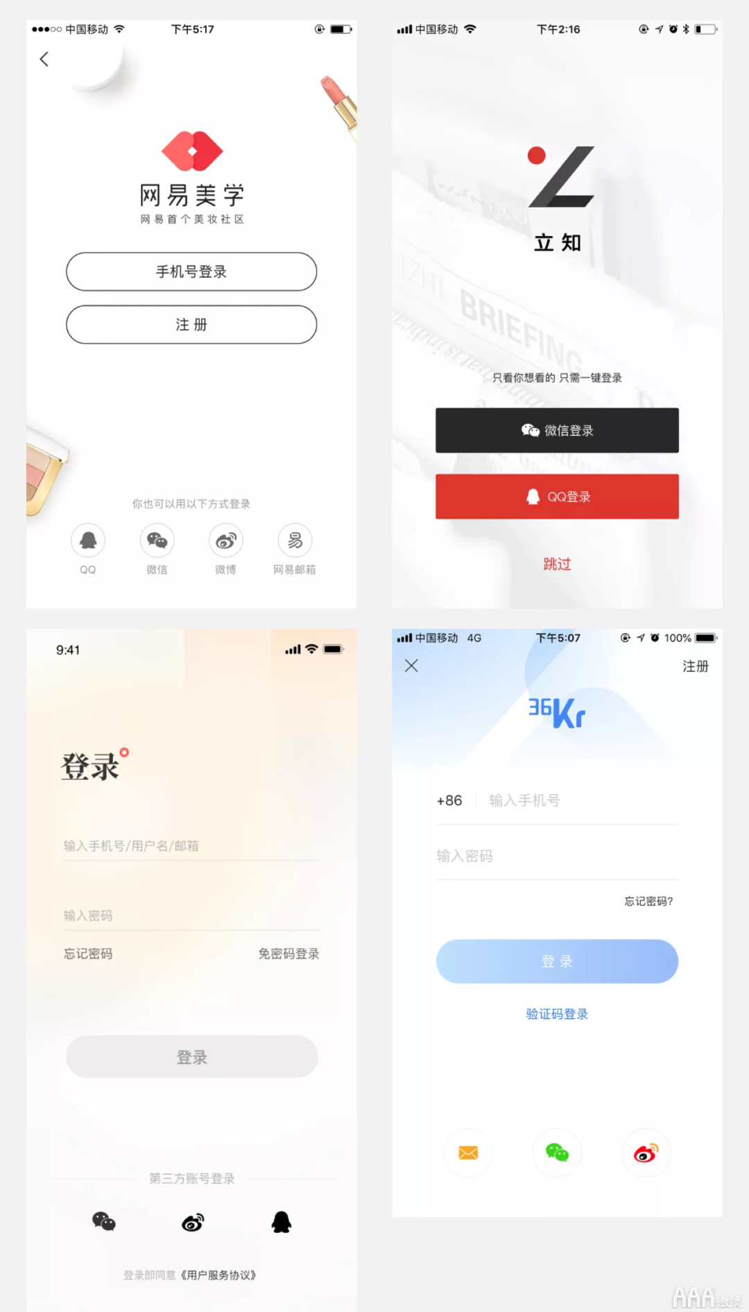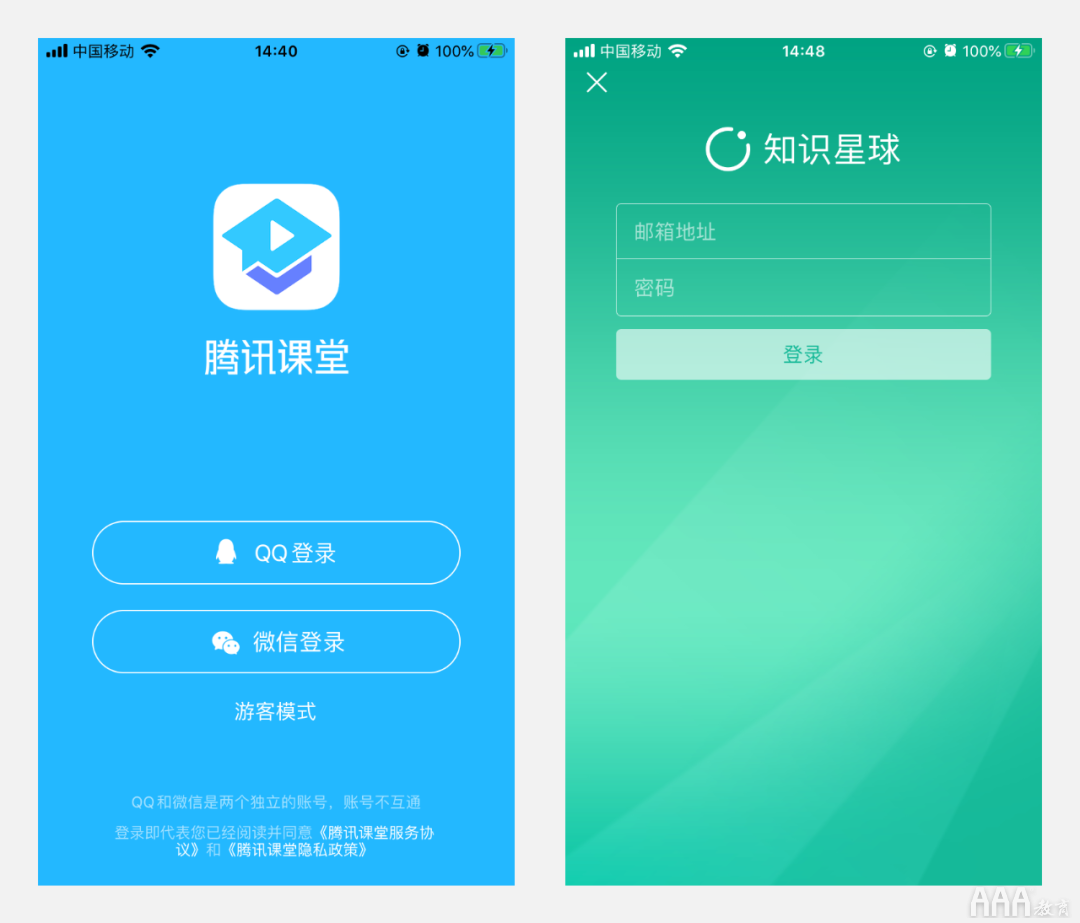 如下图所示:腾讯课堂、知识星球均采用品牌色进行设计,同时可以看出他们的登录信息都较少,在视觉设计上也较为简洁。
