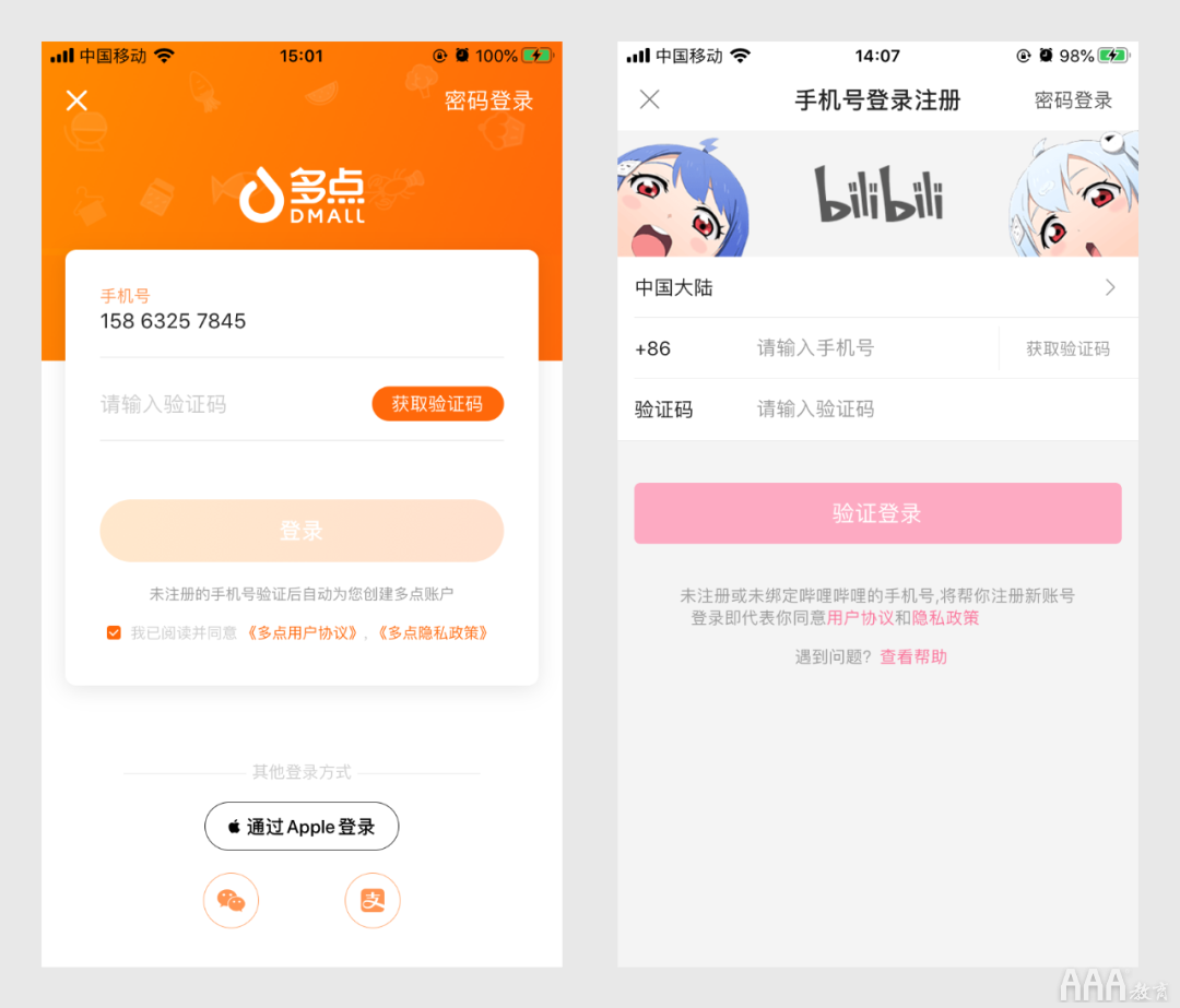 手机号+验证码是比较简便的登录方式,手机号+密码是比较常用的登录方式。在输入手机号后,为了让用户查看是否输入正确,建议手机号显示样式为3-4-4模式(如186 3464 ****)